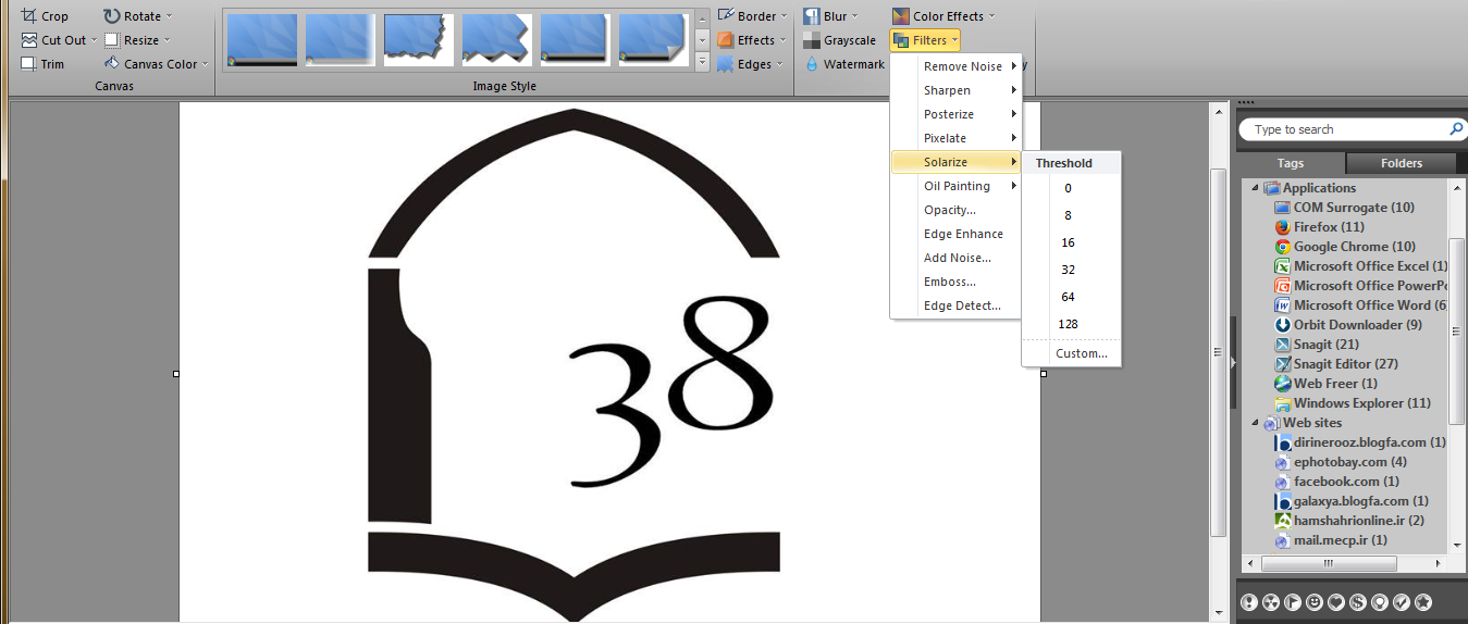 • توسط اولین ابزار به نام Open SnagIt Editor می توانید عکس هایی را که حتی با SnagIt نیز گرفته نشده است را ویرایش نمایید. اگر بخاطر داشته باشید، این صفحه همان صفحه ای است که پس از گرفتن عکس در بسیاری از موارد باز می شد و شما باید از منوی File ، گزینه ی Save as… را برای ذخیره ی عکس خود انتخاب می کردید.در این قسمت ابزاری مانند فلش های یک طرفه ، دو طرف در اشکال مختلف و ابزاری برای مشخص کردن محدوده خاص و مواردی از این قبیل در اختیار دارید که بسیار کاربردی می باشند.